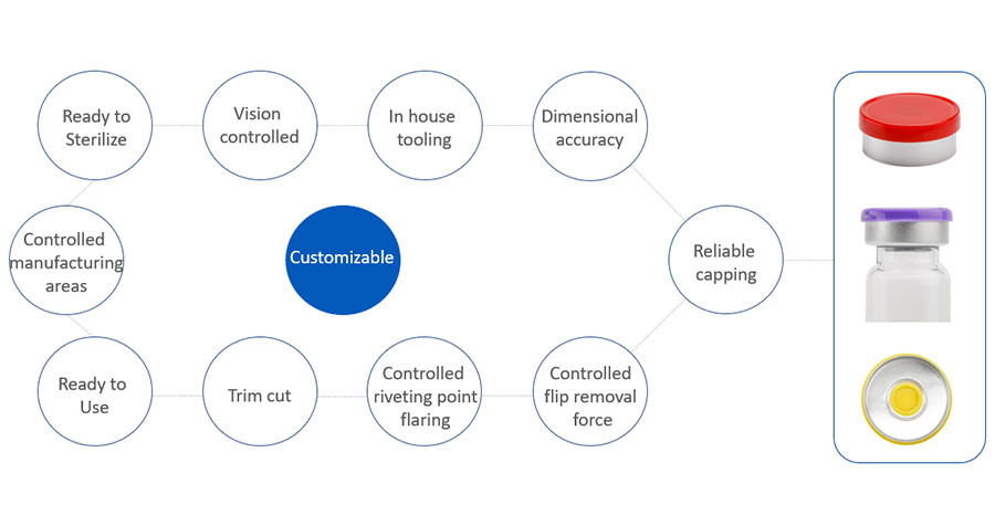 | KAISHA Packaging manufactures & supplies a large range of Aluminium seals for Pharmaceutical use. These seals are manufactured using high quality input materials along with a highly stable manufacturing & inspection controls, which in turn, translates to consistent crimping quality & improves finished product yield |